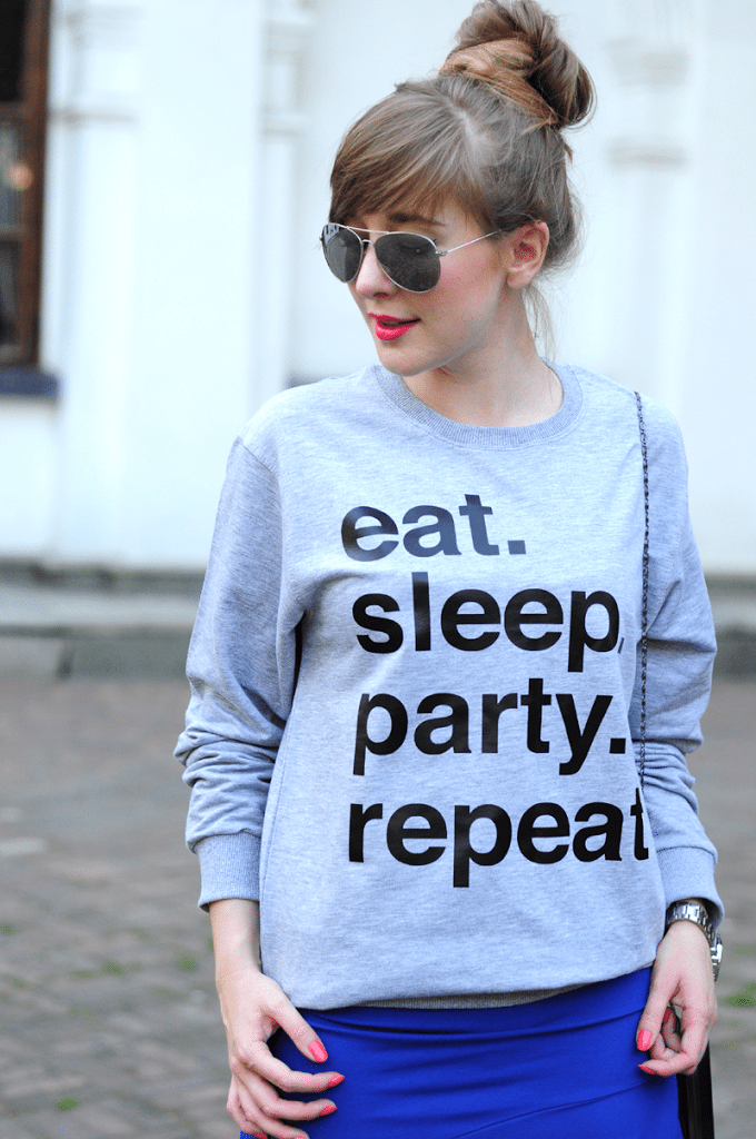 Eat. Sleep. Party. Repeat – miejska stylizacja: bluza ze spódniczką