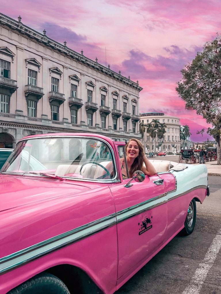 Przejazd klasycznym samochodem od 30 do 40 CUC za godzinę – objazdówka po fajnych miejscach w Havanie. Takiego kierowcę możesz znaleźć w samym centrum przed Gran Teatro i koniecznie się targuj. My jeździliśmy tym pięknym różowym autem za 30 CUC i za tyle samo pojechaliśmy nim następnego dnia na lotnisko. Przy okazji takiej wycieczki zobaczysz wiele charakterystycznych miejsc dla stolicy i rozeznasz się, gdzie warto jeszcze pójść, a co można sobie odpuścić (jak plac rewolucji w moim przypadku).
