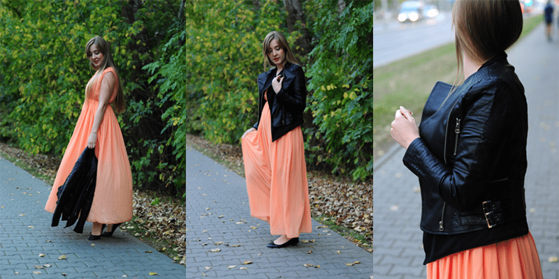 sukienka maxi brzoskwiniowa kurtka sheinsideZapomniany outfit z września. Zdjęcia wyszły za ciemne, za zimne i za brzydkie, żeby je pokazać na blogu. Dodatkowo podczas ich przeglądania odkryłam, że mam nie tylko BAD HAIR DAY ale i BAD FACE DAY. Pozwolicie więc, że sobie je daruję. Maxi sukienka z choies, chociaż ma cudowny kolor, tak mi obrzydła przez te zdjęcia, że wylądowała na vinted. Możecie tam na bieżąco śledzić, co wywalam z szafy. Ramoneskę z sheinside jeszcze zobaczycie na blogu.