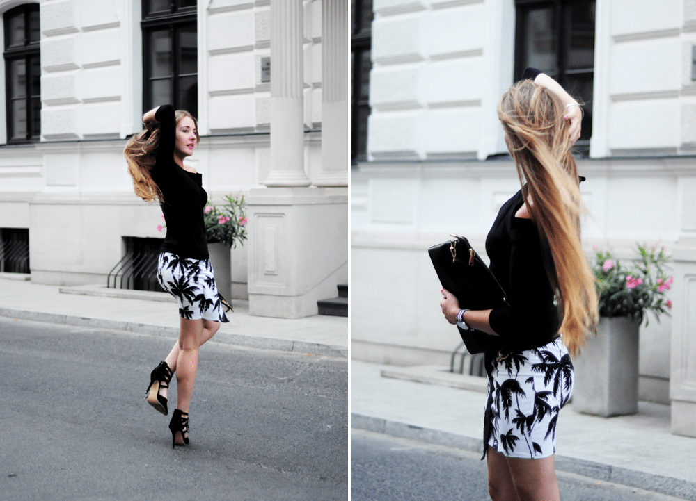 >  Moda   >  Czarno – biała stylizacja z wakacyjną spódnicą w palmy