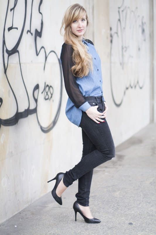 Jeansopodobna koszula z transparentnymi rękawami jest dla mnie jednym z tych elementów garderoby, które zawsze będę łączyć w podobny sposób. Mam wrażenie, że wraz z czarnymi spodniami w wersji skinny tworzy idealne połączenie i może dlatego tak ciężko mi przełamać ten schemat. Z myślą o niej kupiłam kolejne spodnie, co w moim wykonaniu jest dość niezwykłym zakupem 😉 Zarówno mój tatuś jaki chłopak zgodnie stwierdzili „No, spodnie. Dziurawe.” i jeśli nie czujecie tutaj ani odrobiny entuzjazmu, to macie rację. Najważniejsze jednak, że podobały się Kamili i pewnie dlatego popełniła tak doskonałe zdjecia.