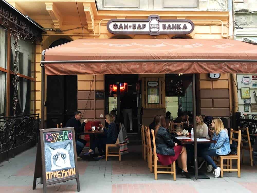 Restauracja w której wszystkie dania i napoje podawane są w słoikach. Lwów jest ogólnie bardzo kreatywnym miastem i większość knajpek ma na siebie jakiś pomysł. Tego właśnie najbardziej brakuje mi w warszawskich restauracjach, które dzielą się tylko na „modne” i „zwyczajne”. A i te modne nie mają w sobie nic niezwykłego. W bańce panuje fajny, przyjazny turystom klimat. Piliśmy tam pyszne mojito i zagryzaliśmy typowymi lwowskimi przekąskami. Graliśmy w planszówki, które przynieśliśmy ze sobą i w karty. Dopiero później dowiedzieliśmy się, że we Lwowie w miejscach które serwują jedzenie nie można w ogóle grać w karty, bo hazard jest zabroniony nie graliśmy na pieniądze, tylko w Makao, ale mimo to w dwóch innych knajpach poproszono nas o schowanie kart). W bańce można grać, bańkę warto odwiedzić!