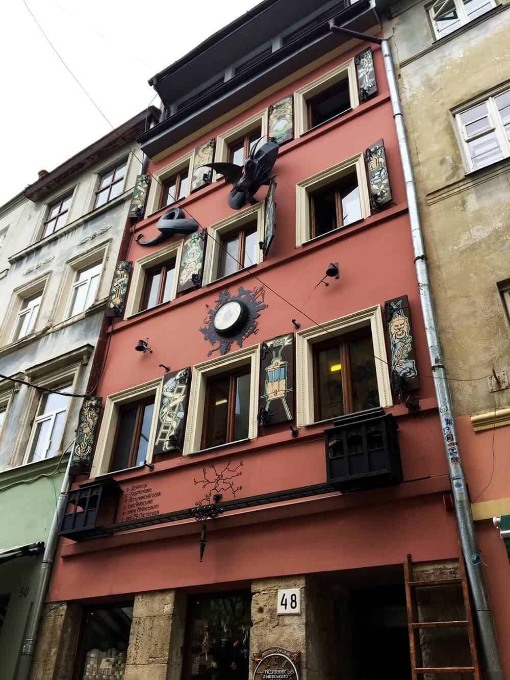 Jedna z najciekawszych, jeśli nie w ogóle najciekawsza restauracja, jaką w życiu widziałam. Mieści się w wielopiętrowej kamienicy i składa się z kilku różnych sal, z której każda ma swój motyw przewodni w postaci lwowskiej legendy. Bardzo żałuję, że w środku nie można robić zdjęć, bo bardzo chciałam Wam to pokazać. Kelnerami w Domu Legend są karły (!), a kiedy czekasz na swoje danie zadają Ci zagadki. Karta jest bardzo krótka, a my wpadliśmy tylko na drinka i przekąski (piwne mojito, chlebki z sosem serowym na przekąskę), więc nie jestem w stanie powiedzieć czy warto tam zjeść, ale na pewno trzeba tam pójść i zobaczyć ten dom osobliwości. Wyobraźcie sobie, że na dachu tego budynku stoi sobie zabytkowy samochód (trabant na warszawskich blachach…), do którego można wsiąść, a zaparkowany jest zaraz koło posągu karła w kominie, który to posąg z tego co zrozumiałam stanowi cenny zabytek. Jeśli mało Wam dziwadeł w domu legend, to dodam, że schodząc z dachu trzeba mieć parasolkę, bo na głowę spadają nam monety nie wiadomo skąd, a punktualnie o 21 kominiarz, stróż legend rozpoczyna show z udziałem tramwajów i ziejącego ogniem smoka, którego widzicie na zdjęciu. Mieści się Wam to w głowie? Mnie nie. To jest punkt obowiązkowy każdej wycieczki do Lwowa i podejrzewam, że trzeba przyjść tam nie raz i nie dwa, żeby lepiej poznać to miejsce!