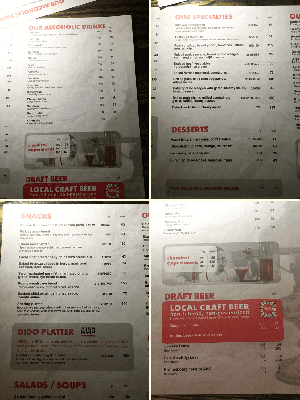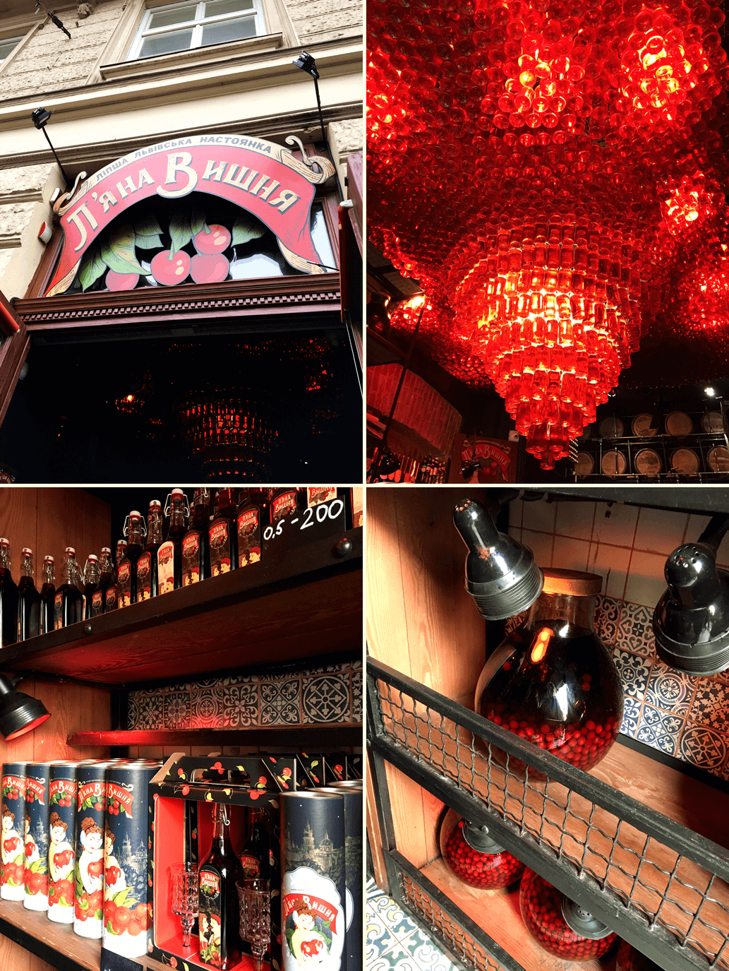 W zasadzie nie jest to restauracja, bo jedzenia tam nie uświadczycie, to jest raczej sklep z pyszną, domowej roboty wiśniówką, którą możecie kupić na shoty lub w wersji butelkowanej (kilka rozmiarów + pakowane na prezent). Nie skłamię jeśli powiem, że to najlepsza wiśniówka jaką w życiu piłam! Czuć, że jest zrobiona z dojrzałych, prawdziwych wiśni, a nie chemicznego aromatu. Z okazji majówki chyba podnieśli lekko ceny – 36 uah za około 70 ml wiśni, ale warte każdego grosza! Obsługa przemiła, do każdej porcji dorzucane są wiśnie nasączone w alkoholu. Musicie, musicie, musicie tam zajrzeć!