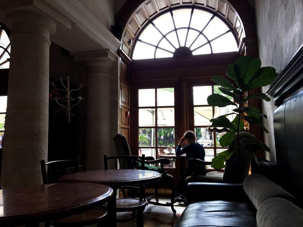 Na zdjęciu powyżej widzicie kolejkę po śniadanie za niecałe 20 zł w opcji „szwedzki stół, jesz ile Ci się zmieści plus kawa i kieliszek musującego wina lub wódki”. Cena jest stała, przy wejściu kupuje się bilet, dodatkową kawę lub herbatę można zamówić na rachunek. W tamtym roku Ania była tam z koleżankami i była zachwycona – pyszne jedzenie, piękny wystrój, muzyka na żywo i śpiewające kanarki. W tym roku było to jednak największe rozczarowanie naszego wyjazdu. W tej kolejce spędziliśmy ponad dwie godziny w zabójczej temperaturze i gdy byliśmy już praktycznie przy kasie… śniadanie się skończyło! Tak moi drodzy, podaje się je do 11, więc niestety nie udało nam się załapać. Dopiero kilka dni później, kiedy kolejka była mniejsza, weszliśmy spróbować. Jeśli będziecie we Lwowie, na pewno warto tam zajrzeć, ale tylko jeśli nie będzie kolejki. To nie jest nic na tyle nadzwyczajnego, żeby stać przez dwie godziny w ogonku, a potem pchać się do koryta. Wystrój jednak faktycznie okazał się warty uwagi: