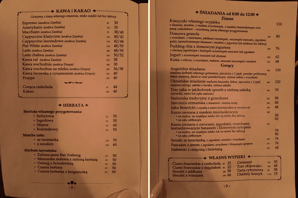 Jedna z polecanych w przewodnikach restauracji, którą udało nam się odwiedzić dopiero ostatniego dnia. Przyjemne wnętrze, miła choć powolna obsługa i dobre jedzenie, chociaż nie tak dobre, żeby śniło nam się po nocach. Jeśli będziecie w pobliżu, wpadnijcie tam, ale specjalnie nie warto się tam wybierać. Zamówiliśmy pierogi, chociaż pora była zdecydowanie śniadaniowa. Dania były smaczne jak wszędzie we Lwowie. Mam wrażenie, że tam polska kuchnia jest smaczniejsza niż w Polsce!