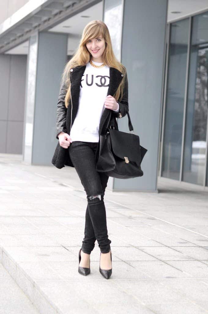 dziura w spodniach – to lubię 😉 torebke podziwiam już od poprzednich postów ,a koszulka + naszyjnik to mistrzostwo