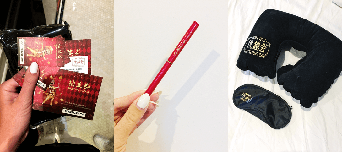 O chińskiej gościnności również wspomniałam. Jeśli ktoś potrafi poukładać odpady z ekspresu do kawy uformowane na kształt ciasteczek na białej serwecie umieszczonej na tacy przed restauracją, a potem czekać aż jakiś durny turysta tego spróbuje, to możecie sobie pewnie wyobrazić, jak gościnne okazały się kasyna. Serio, przyszłam zobaczyć jak tam ubierają się ludzie, jak się bawią, z kim przychodzą, jak grają, jak reagują na zwycięstwa i porażki. Przyszłam poobserwować, zobaczyć coś nowego i poznać inną kulturę. Nie poszłam tam na darmowy lunch czy pić ich kawę za free. Jednak jeśli jakaś firma szczyci się tym, że ich goście obsypywani są prezentami, a potem wręcza mi z dumą plastikowy długopis, to ciężko nie parsknąć śmiechem. Lepiej nie częstować gościa niczym, niż głosić wszem i wobec że podaje się wspaniałą kawę, a potem podać mu coś takiego, bo to skąpstwo i żenada. Oto nasze ekskluzywne pamiątki: