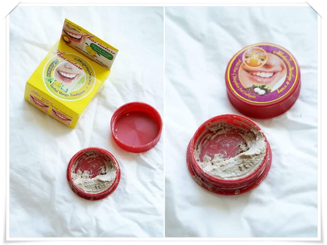 Tajska pasta do zębów to produkt, na który już rok temu zwróciłam uwagę. Bałam się jednak ryzykować z niesprawdzonymi składnikami, dlatego nie zdecydowałam się na zakup. Najpopularniejszy tego typu produkt widzicie na zdjęciach poniżej (dwóch producentów, jednak pasty te mają podobny skład i niemal identyczne opakowania), dostępne są praktycznie na każdym kroku (głównie na bazarach i w sklepach z kosmetykami) i kosztują od 3 do 5 zł, zależy od tego, jak dobrze się targujesz. Kosmetyki sprzedawane na bazarze są tym tańsze, im więcej chcesz ich kupić. Najbardziej opłacało się wziąć cały karton tej pasty, ale póki co nie jest mi potrzebna taka ilość. W tym roku jestem znacznie bardziej otwarta na eksperymenty i właśnie kończę trzecie opakowanie swojego wybielającego specyfiku. Pozytywne recenzje przeczytane online również miały na to wpływ. Wyobraźcie sobie, że ten środek zbiera pochwały nawet od dentystów. Pasta ma krótki, naturalny skład i nie zawiera fluoru. Jedyną jej wadą jest to, że ma bardzo małą pojemność (25 g), chociaż jest dość wydajna (nie nakłada się jej tyle, ile zwykłej pasty). Doskonale oczyszcza, bardzo się pieni. Co do wybielania, ciężko mi to określić, ale wydaje mi się, że faktycznie działa. Zrobiłam nawet dla Was zdjęcia przed i po, ale z uwagi na to, że światło zmienia się tu każdego dnia, nic na nich nie widać. Niestety nie mogłam zabrać w podróż lampy, więc wpisy z podróży nieco cierpią na jakości…