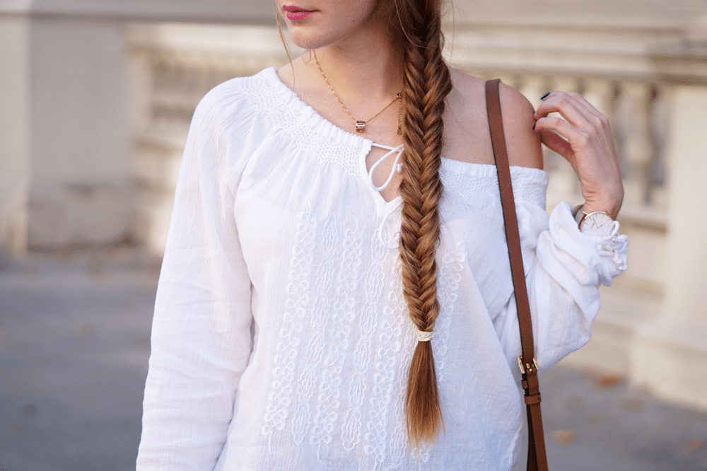 Lekka stylizacja boho: koszula off-shoulder i kozaki z frędzlami