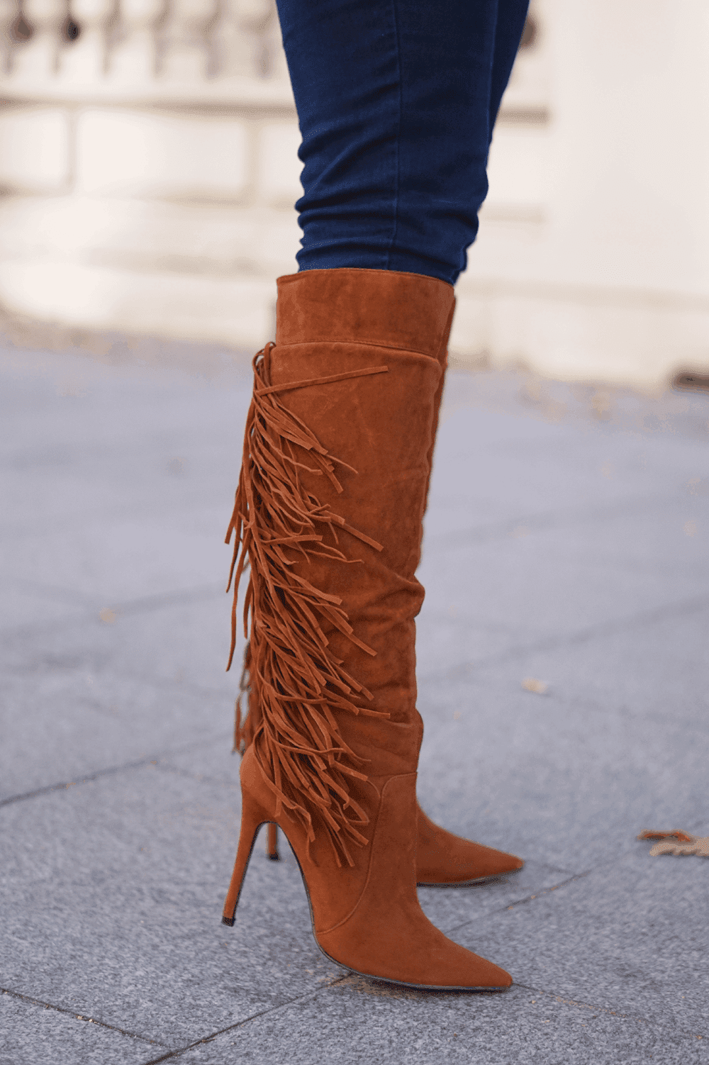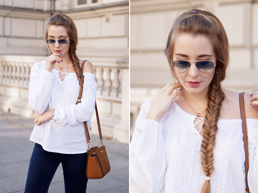 Lekka stylizacja boho: koszula off-shoulder i kozaki z frędzlami