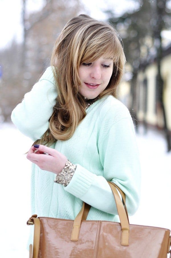 Ten miętowy sweterek jest śliczny i bardzo pasuje do Twojego typu urody. 🙂 Patrząc na te zdjęcia zachciało mi się śniegu. :))