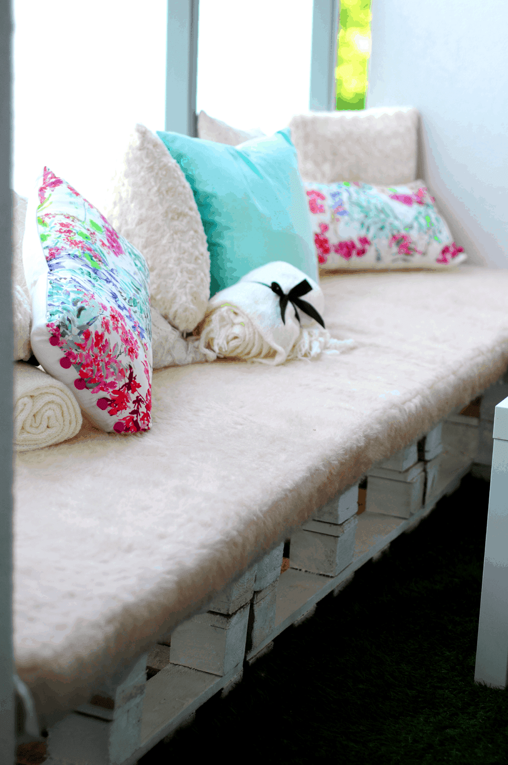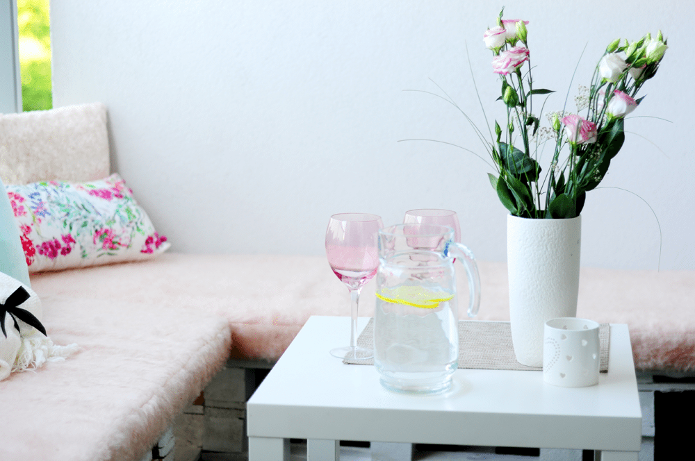 Idealny balkon wymarzyłam sobie kiedy jeszcze mróz drapał w okna, przez które nie chciało się nawet wyglądać. Nie wiedziałam, jak ma wyglądać, chciałam tylko, żeby był piękny. Pamiętacie garść inspiracji? Nie mogłam się zdecydować – paryski balkonik z białymi krzesłami i szklanym stołem na cappuccino, czy funkcjonalna drewniana ława, na której zmieszczą się wszyscy moi przyjaciele. Ostatecznie, rzecz jasna, wybrałam drugą opcję. Narożnik zbudował mój Łukasz, własnymi siłami. Stanęło na modnych ostatnio paletach, pomalowanych na biało. Można je dostać w nieziemsko niskiej cenie! Odpowiednio docięte i przystosowane do naszej przestrzeni dają niesamowity efekt. Materace uszyliśmy z gąbki powleczonej różowym materiałem „misiem” odkopanym w niezbadanej głębi szafy cioci. Poduchy i dekoracje dostarczył niezawodny F&F home i tak oto, niewielkim kosztem stworzyłam swoje idealne miejsce w domu. Gdybym nie miała balkonu od zachodu i słońce nie smażyło mi szarych komórek przez mniej więcej połowę dnia, siedziałabym tam bez przerwy. A oto efekt końcowy: