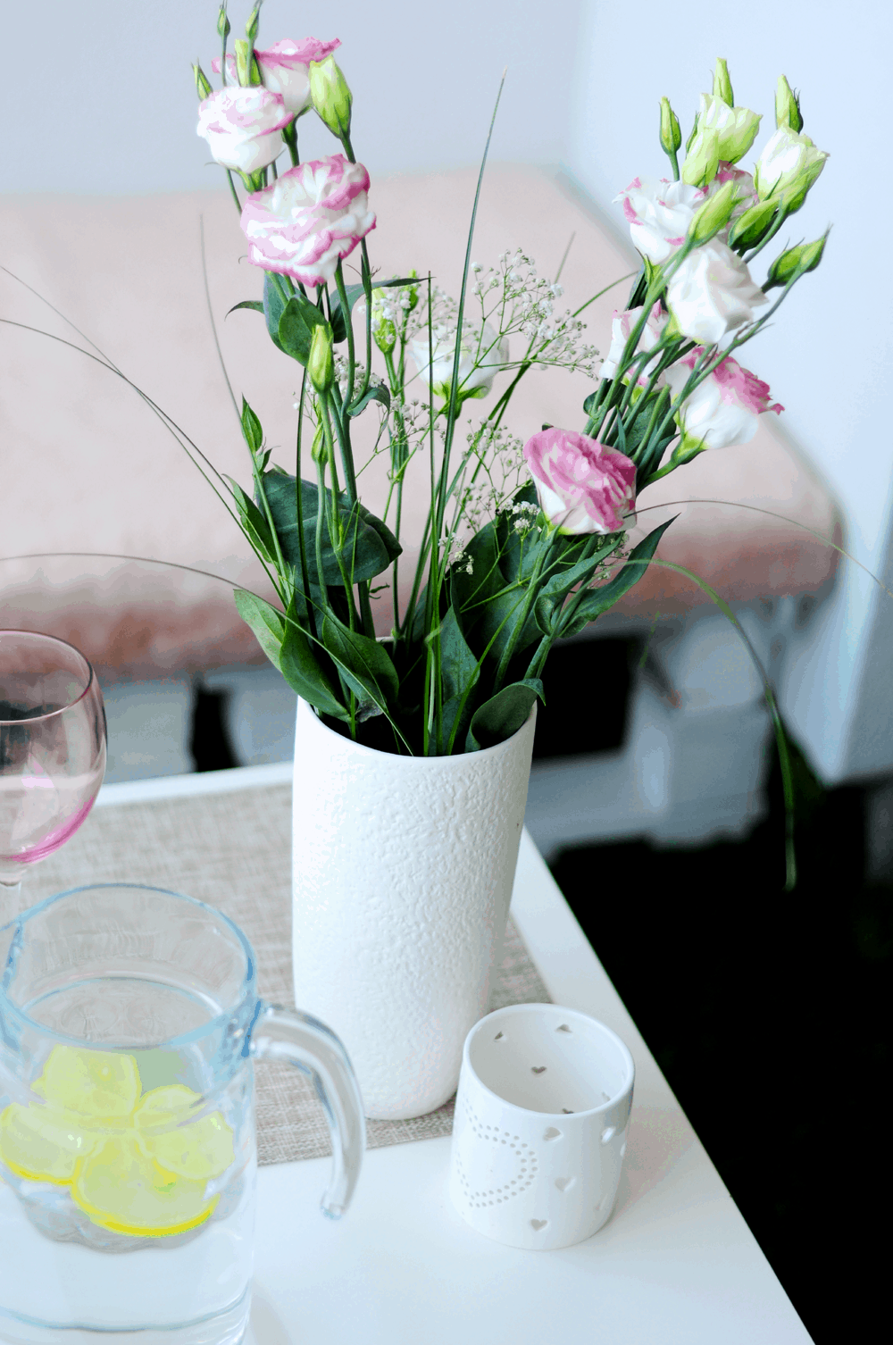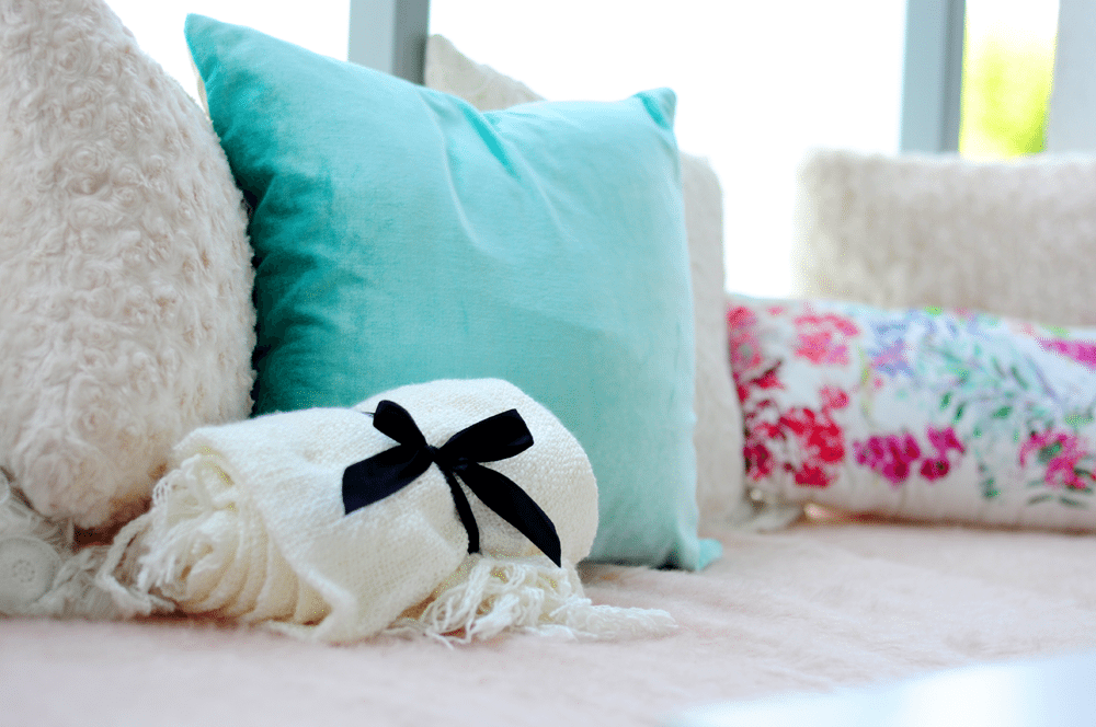 kolorowe poduszki, miętowe poduszki, biały wazon (nie ma go na stronie), koronkowe poduszki, poduszki – serduszka, poduszki z motywem róż, pled (nie ma go na stonie), świecznik, różowe kieliszki, podkładka i dzban.
