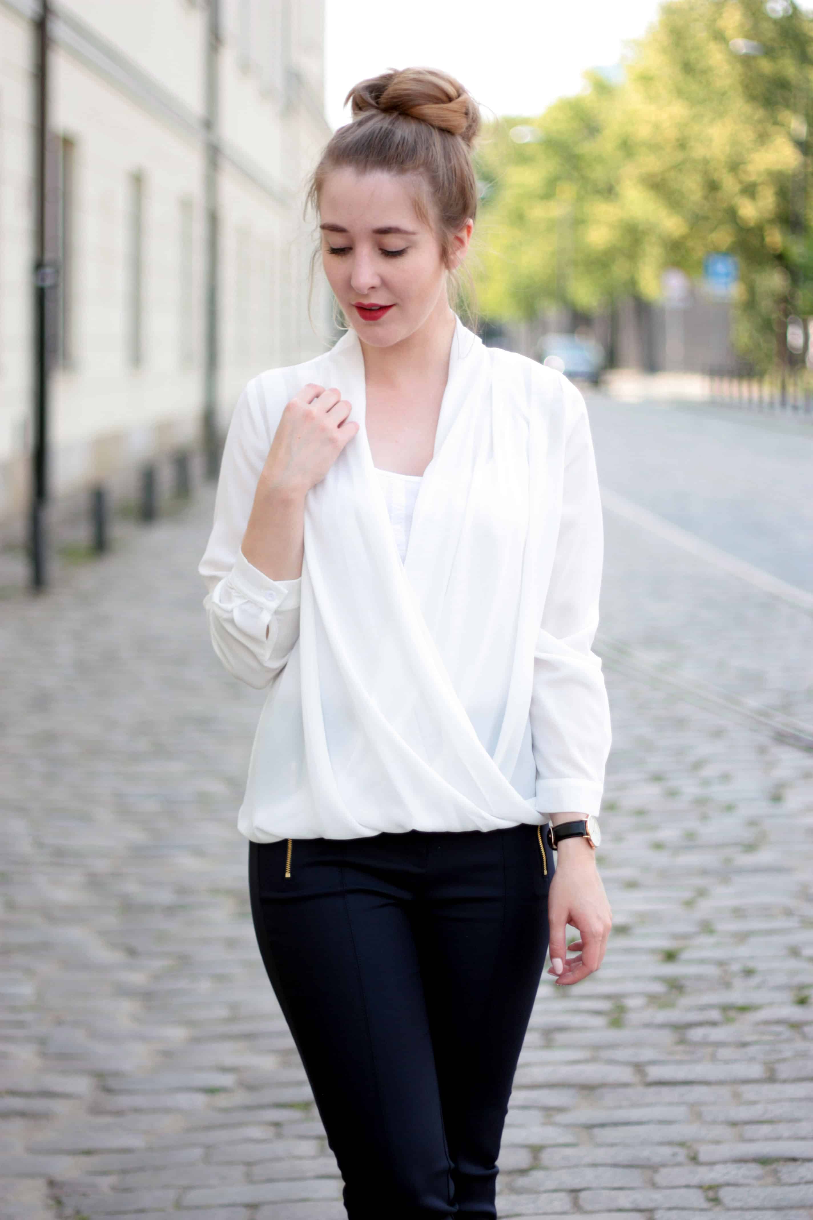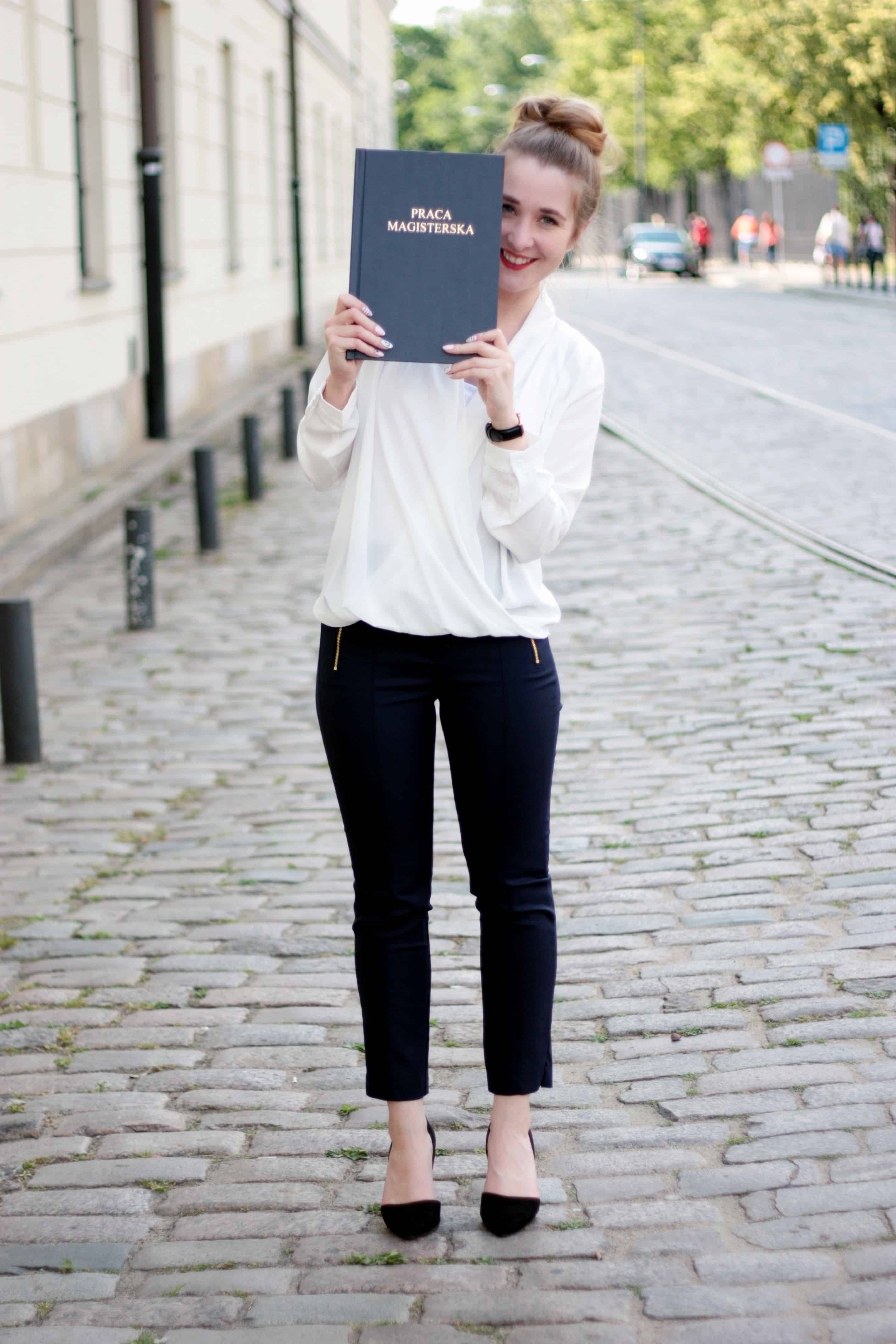 Na tę wyjątkową okazję, która mam nadzieję, więcej się nie powtórzy (obronę) wybrałam najprostszy i najbardziej klasyczny zestaw jaki mogłam. Na naszej uczelni niepisaną zasadą jest dobór stroju do okazji, oczekiwano więc od nas zestawień galowych, a krótkie sukienki i kolorowe bluzki raczej nie wchodziły w grę. Mimo, że na blogu widujecie mnie w różnych wersjach kolorystycznych i stylistycznych, formalny outfit nie stanowi dla mnie żadnego problemu – czuję się w takim wydaniu tak samo dobrze, jak w air maxach i t-shircie. A Wy, lubicie ubierać się elegancko, czy raczej Wam to przeszkadza?