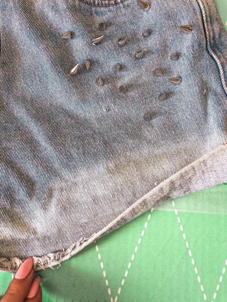 Każda koleżanka pytała, gdzie takie cudo można kupić! Ale moda jak to moda, zwykle jest jednosezonowa. Tak więc kolejnego lata ombre odeszło zupełnie w zapomnienie i nogawki w moich szortach stały się solą w oku. Zamiast wyrzucić, postanowiłam pokombinować dalej. Na topie w tamtym czasie były… ćwieki. Pamiętacie te okropne buty z kolcami przypominające płetwy po bliskim spotkaniu z jeżowcem? No właśnie.