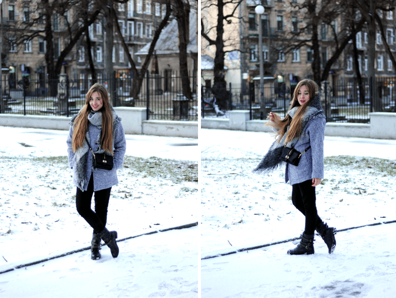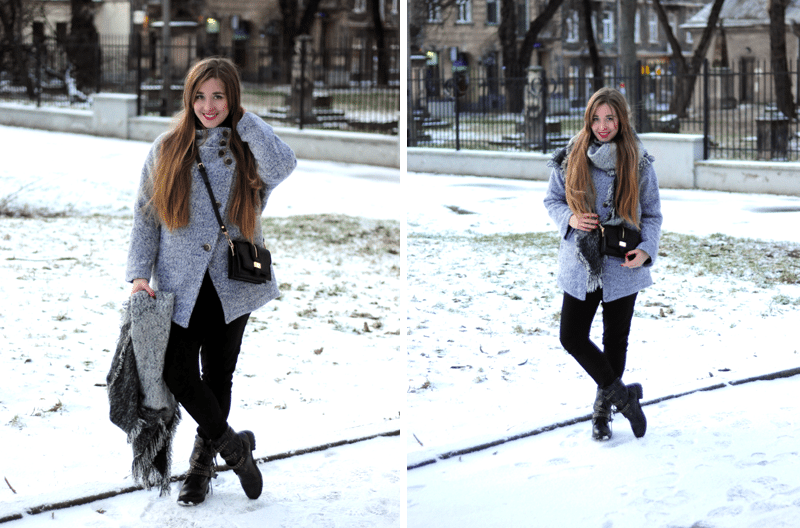 ootd zima 2015 płaszcz sweter szary romwe chusta szal sheinside ciepły szary zestaw z szarym płaszczem romwe sheinside czarna torebka szal ootd zima workery z paskami ćwiekami worker boots za kostkęzdjęcia: Łukasz