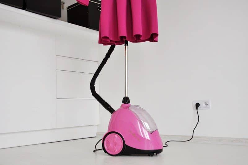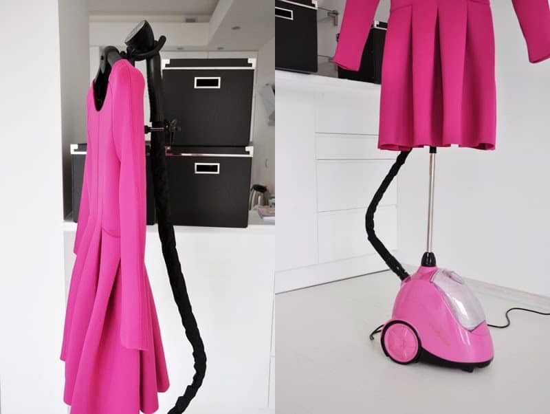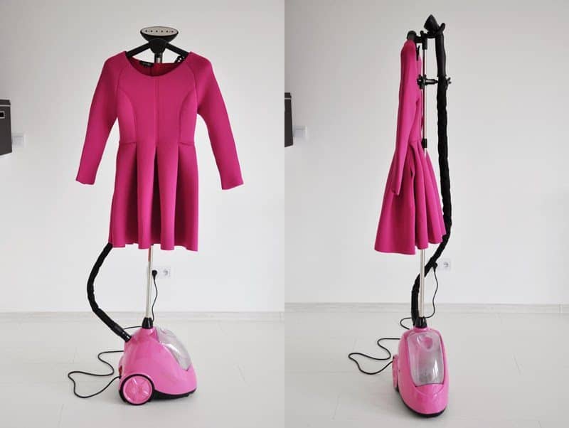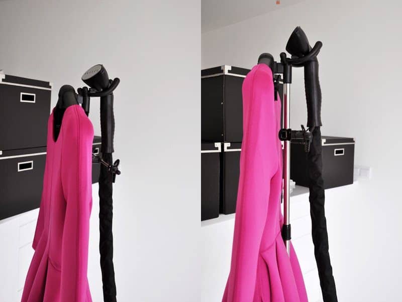 Co najbardziej podobało mi się w Steamasterze – nie potrzebujemy już deski do prasowania, wszystkie ubrania mogą być prasowane na wieszakach, które znajdują się w zestawie (możemy regulować wysokość stojaka, co jest bardzo wygodnym rozwiązaniem). Dla mnie to wielkie ułatwienie, nienawidzę prasować płaszczy i rozkloszowanych spódnic, które dosłownie przelewają mi się przez deskę do prasowania, zsuwają się z niej, a po powieszeniu na wieszak okazuje się, że wcale nie są doskonale wyprasowane. Dzięki prasowaczowi parowemu prasowanie staje się dużo łatwiejsze i przede wszystkim przyjemniejsze.