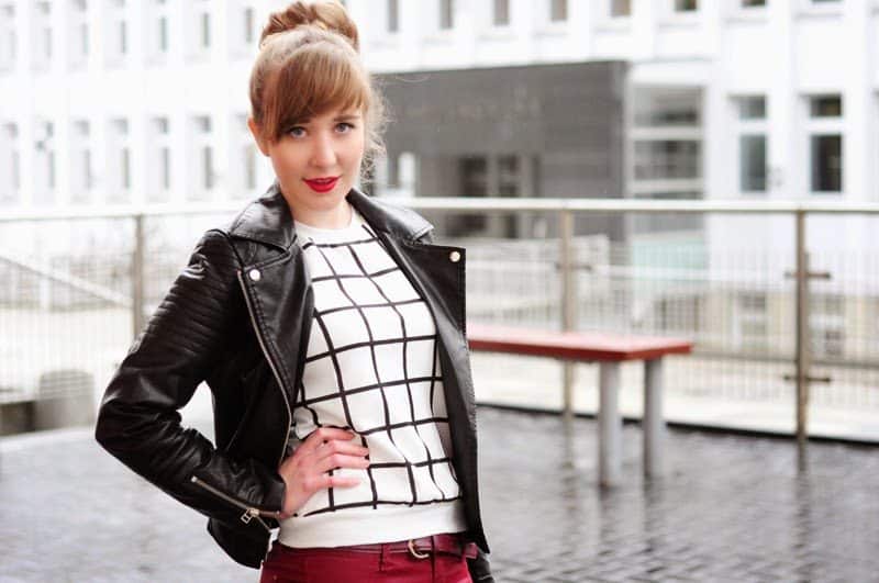 Świetna bluza, bardzo mi się podoba w połączeniu z tymi bordowymi spodniami 🙂