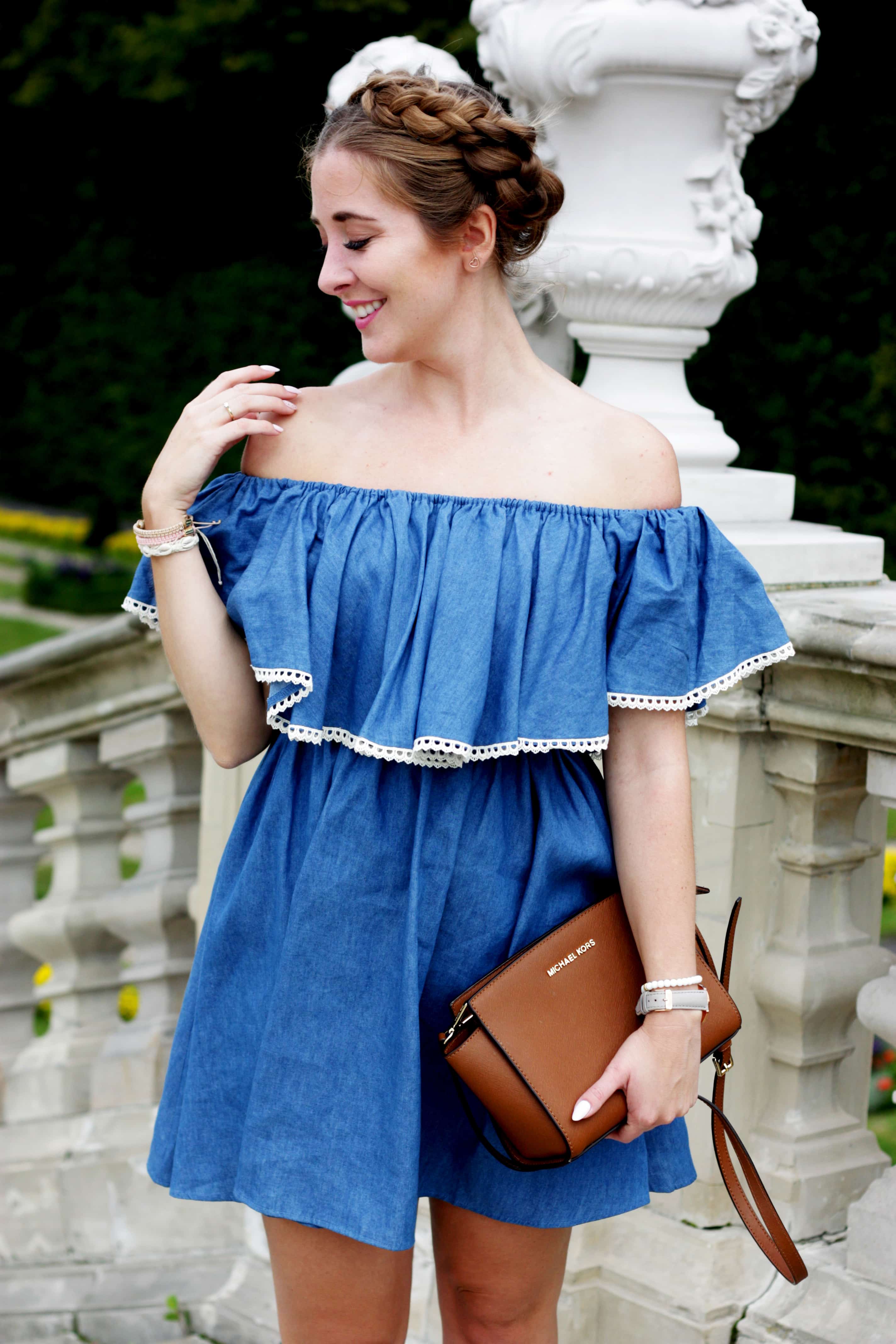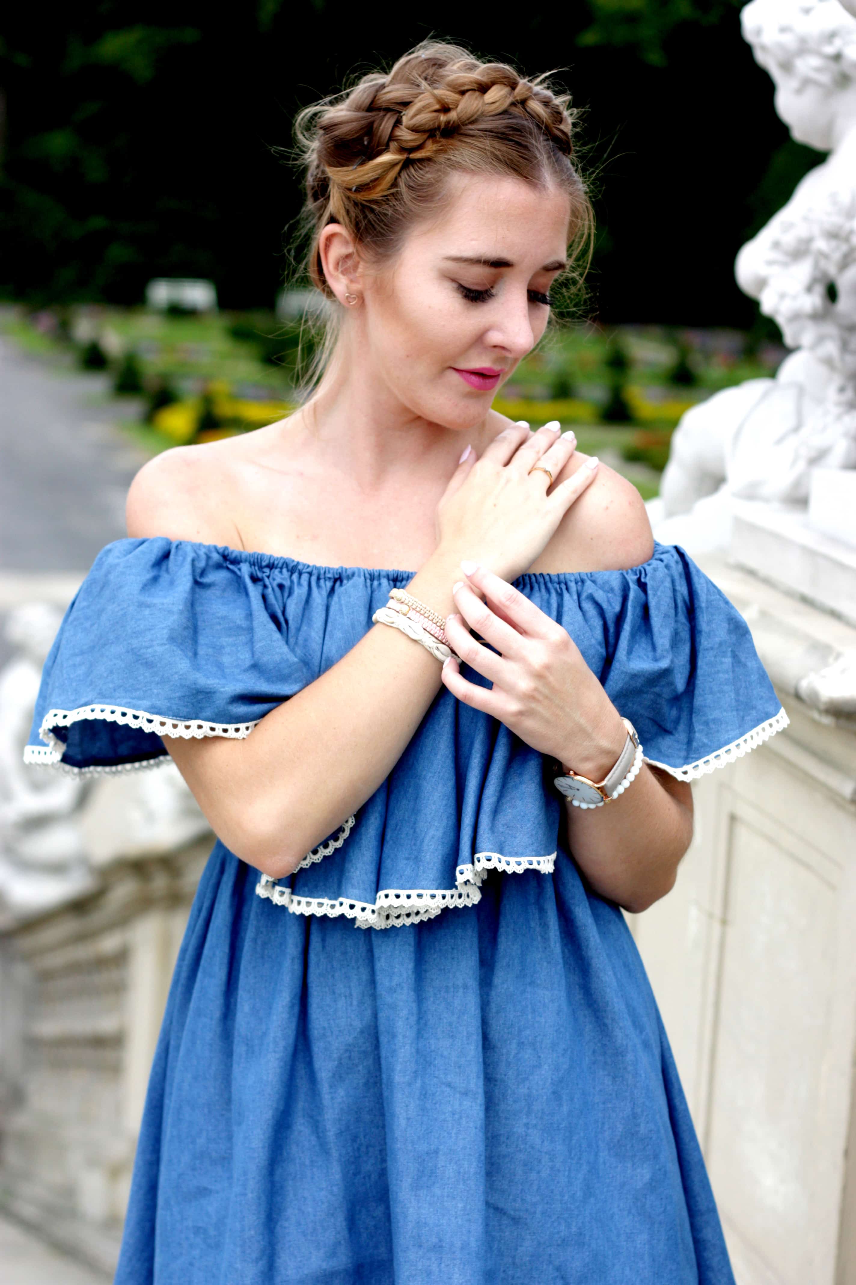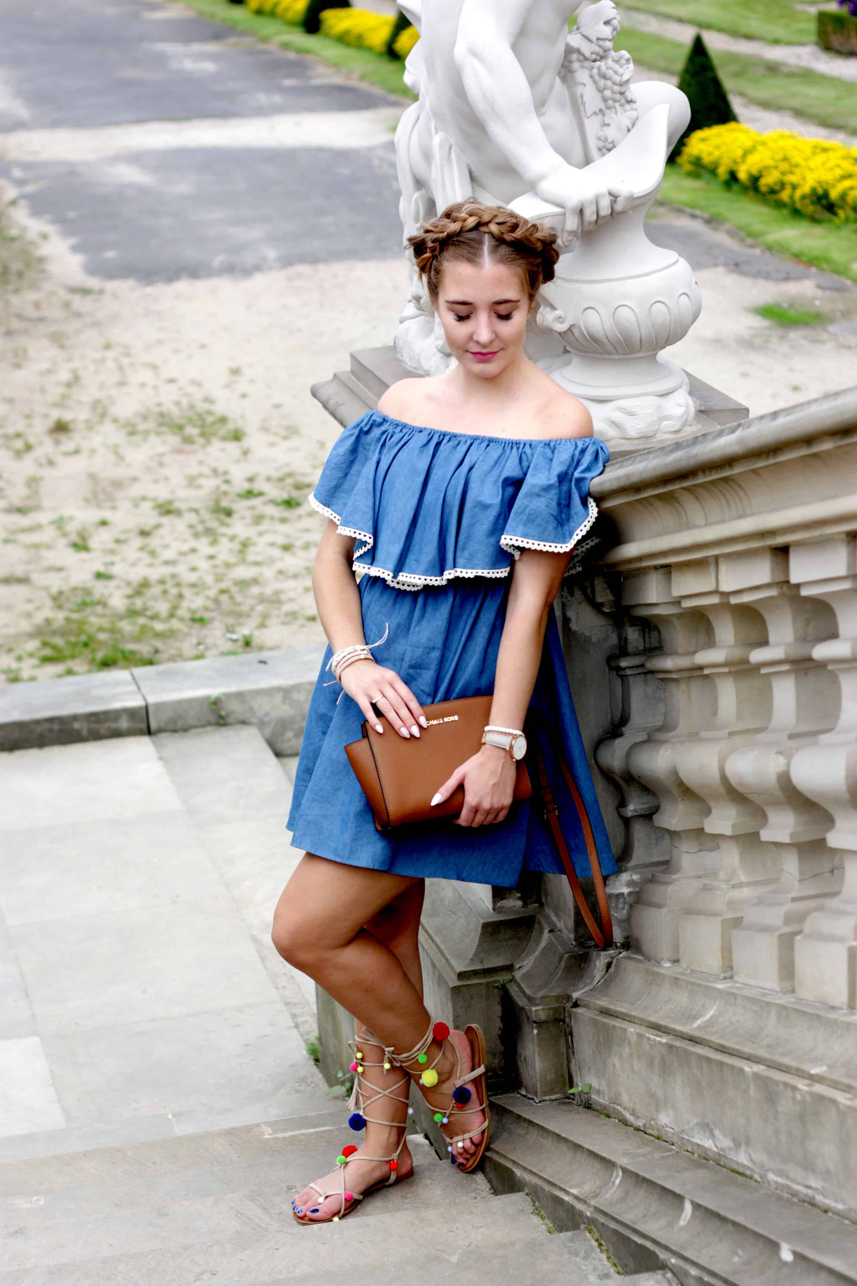 Sukienka hiszpanka offshoulder i sandałki z pomponami