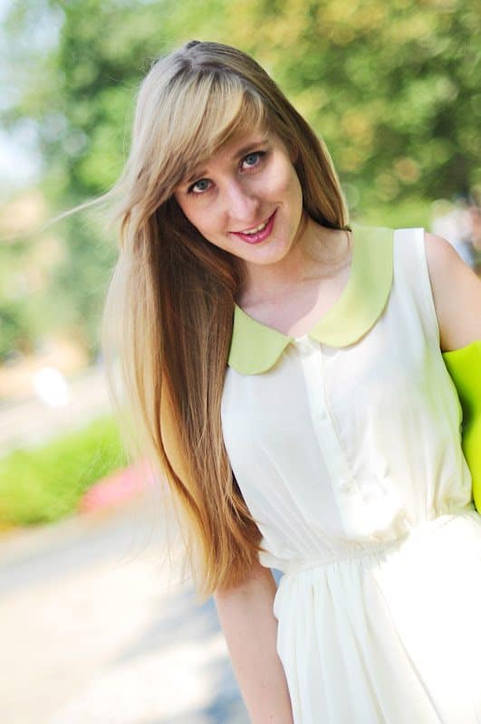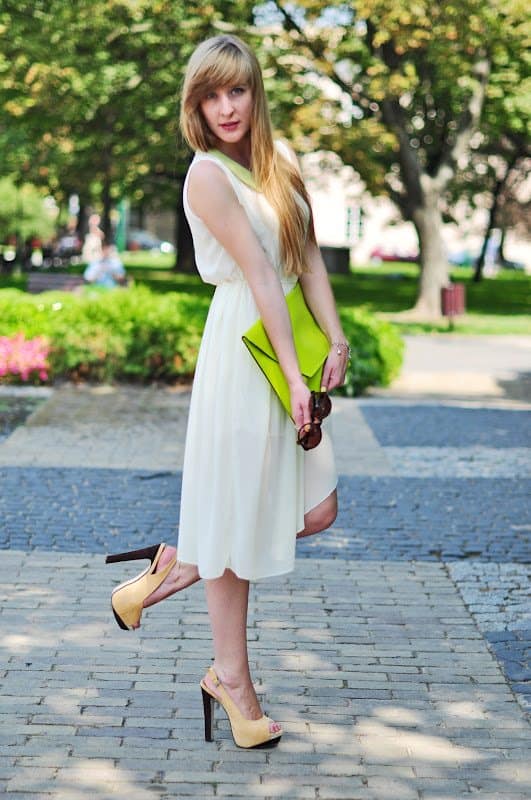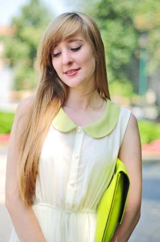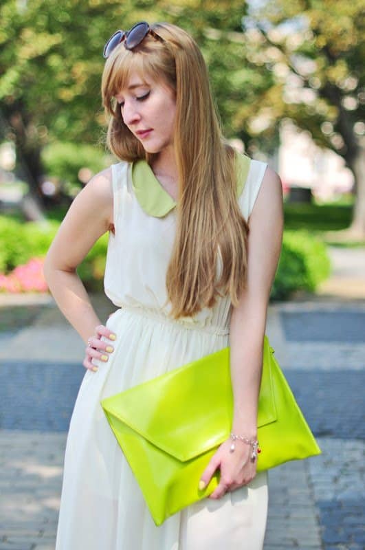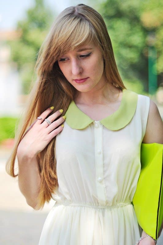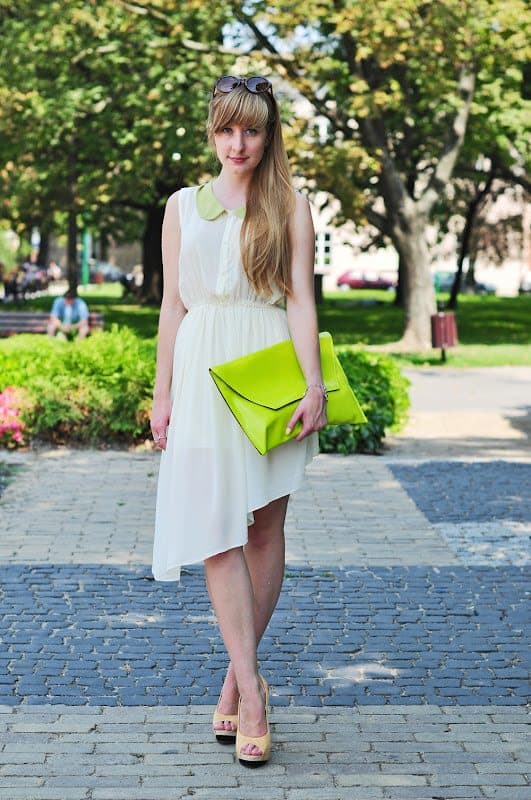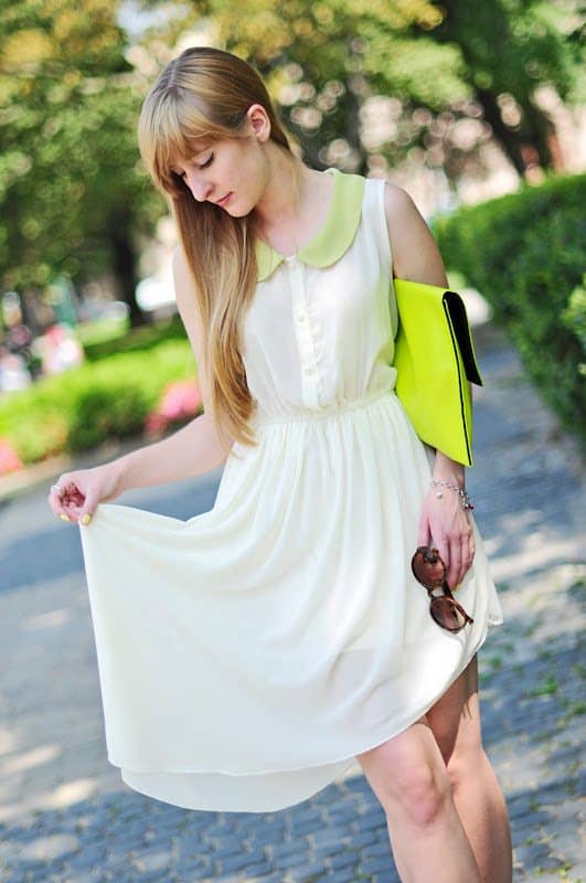 Kiedy po raz pierwszy zobaczyłam sukienkę z Romwe, którą mam dziś na sobie, przywołała u mnie skojarzenie z orzeźwiającymi lodami cytrynowymi. Nie jest do końca biała, raczej śmietankowa, a całość ożywia zielony kołnierzyk oraz interesujący krój. Neonową kopertówkę, oraz wygodne sandałki na słupku już znacie, więc nie trzeba ich przedstawiać 😉 Jak Wam się podoba całość?