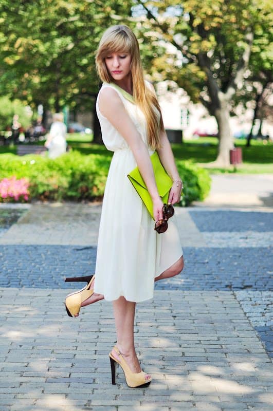 How would you describe the color of this dress? I think lemon ice cream color is a perfect definition. This was my first thought when I saw it. I decided to give her a fresh touch with the neon clutch you already know. Do you like this outfit?