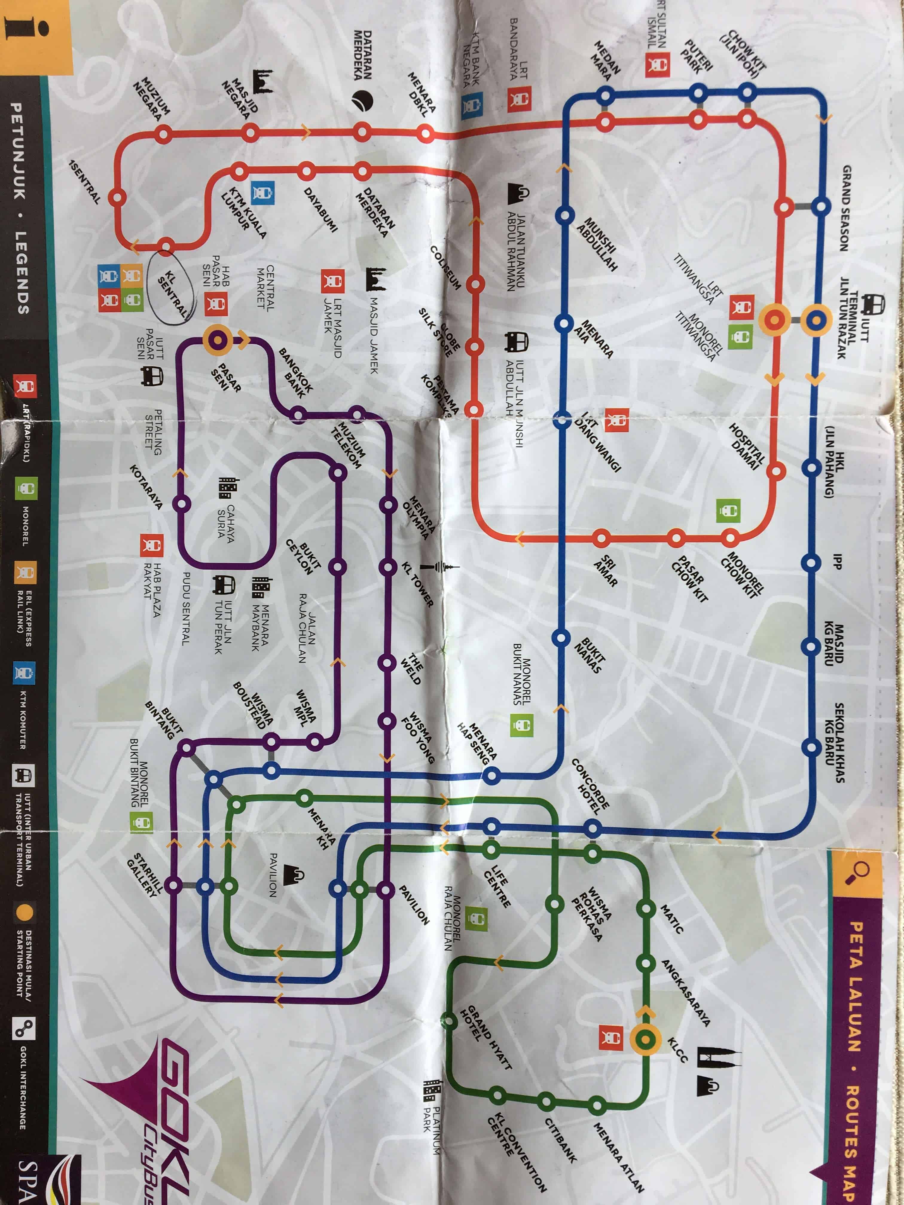 Do Kuala Lumpur wybraliśmy się oczywiście samolotem. Lotnisko jest tam wielkie, ale dobrze oznakowane i świetnie skomunikowane z miastem. Do centrum można dostać się pociągiem KLIAexpress za około 40 zł od osoby w jedną stronę. Standardowa cena to 100 zł w dwie strony, jednak obowiązuje zniżka dla posiadaczy karty MasterCard. Jedzie 33 minuty do miasta. Z dworca głównego natomiast rusza już autobus turystyczny, który jest darmowy. Nazywa się GOKL, ma kilka linii oznaczonych kolorystycznie i wozi turystów po niemal wszystkich atrakcjach zupełnie za darmo! To się nazywa miasto przyjazne turystyce, prawda? Minusem jest fakt, że nie da się zweryfikować pasażerów, więc wielu stałych mieszkańców KL korzysta z darmowej podwózki, przez co w godzinach szczytu autobusy te przypominają wielkie puszki sardynek na kołach. Mapę tras darmowych autobusów znajdziecie w punkcie informacji turystycznej, która znajduje się na dworcu centralnym. Musicie wyraźnie zaznaczyć, że chcecie mapę darmowej linii, inaczej będą chcieli wcisnąć Wam płatną wycieczkę. Na wszelki wypadek ściągnijcie sobie na telefon zdjęcie mojej mapy: